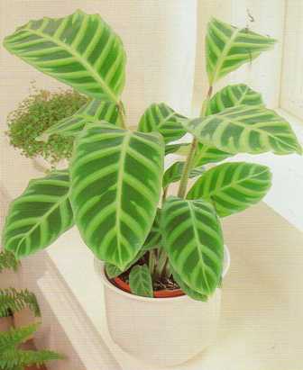 A Calathea lietzei világoszöld levelei sötétzöld csíkosak, fonákjuk fényes vörös. Magassága 50 cm.